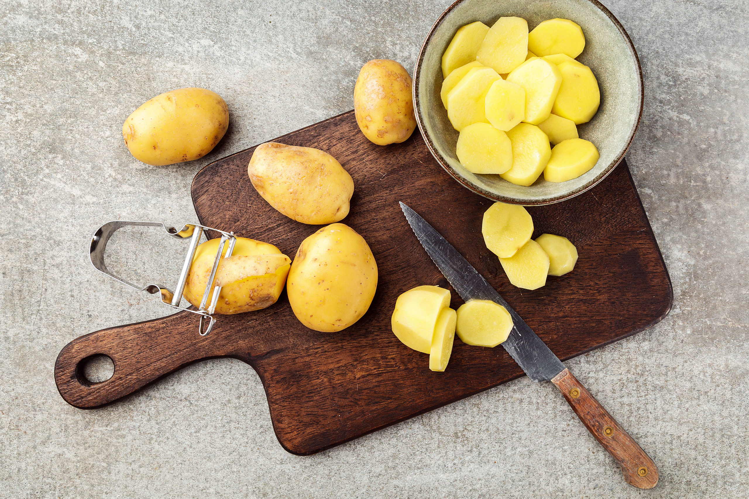 Die Kartoffeln schälen, in gleichmässige Würfel oder Scheiben schneiden.